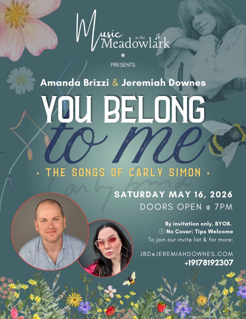 You Belong to Me: The Songs of Carly Simon — is an intimate evening with Amanda Brizzi and yours truly, Jeremiah Downes, for our next Music at the Meadowlark gathering. Together we’ll celebrate the timeless music of the incomparable Carly Simon — with beloved songs, stories, and plenty of laughter in a cozy lakeside setting among friends old and new.