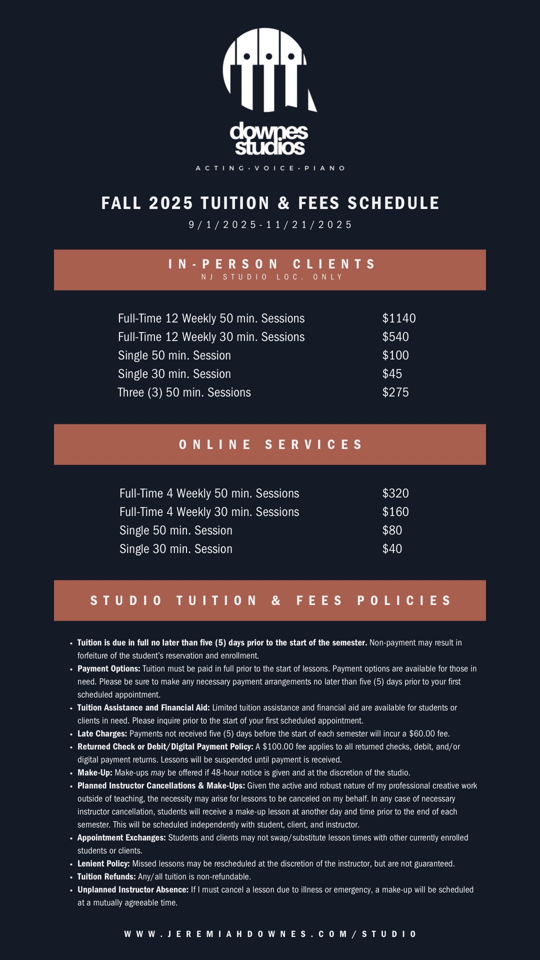 I am currently available for both online and in person lessons in voice, piano and acting with studio locations in New Jersey and Midtown Manhattan. For more information, including initial consultations, tuition and scheduling, please contact me.
